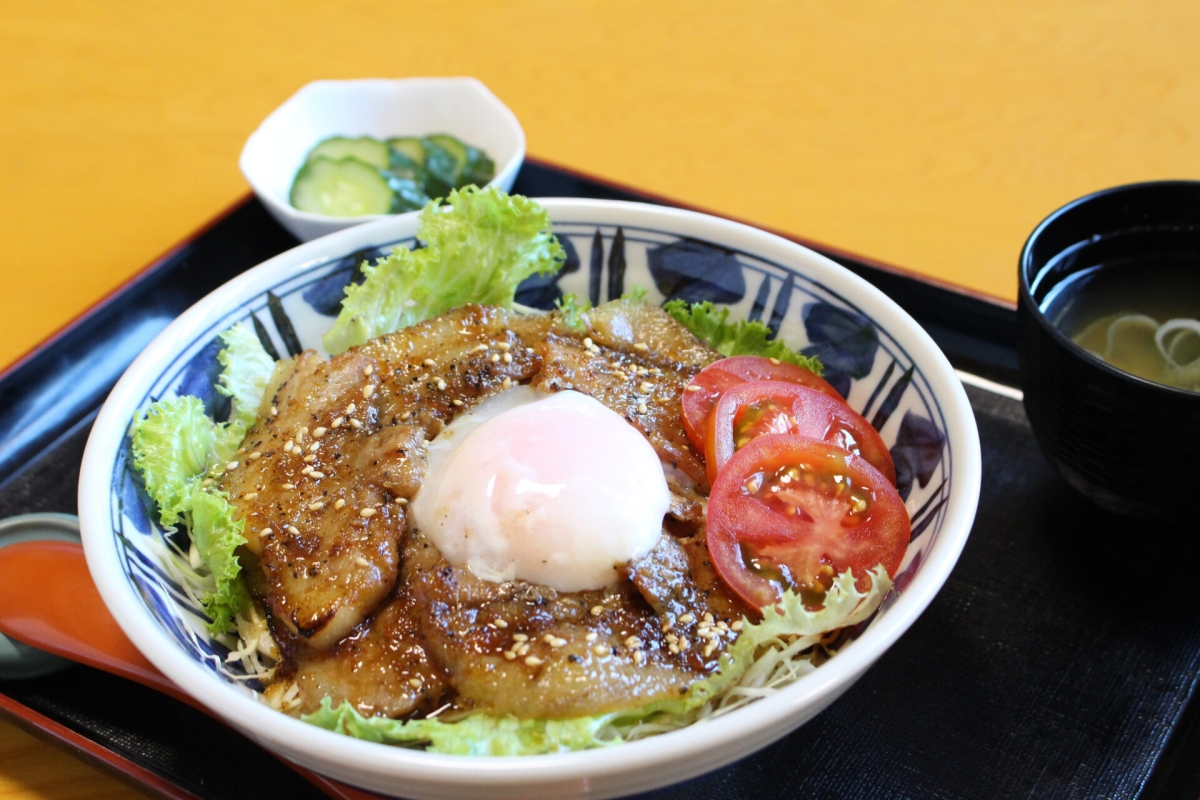 特製のタレをつけ香ばしく焼き上げた豚バラ肉といわき野菜が丼を彩ります。