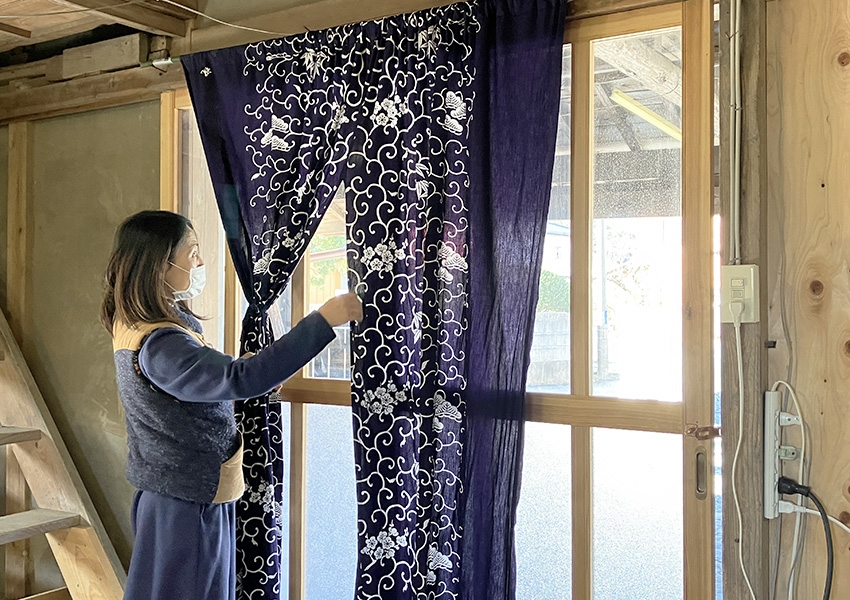 入り口に掛けられている暖簾は代表の坂本さんが、いわきへ嫁いでくる際に持ってきた嫁入り道具を暖簾にしたもの。藍色に染められた暖簾は松竹梅の縁起の良い柄で直売所のシンボルとなっています。