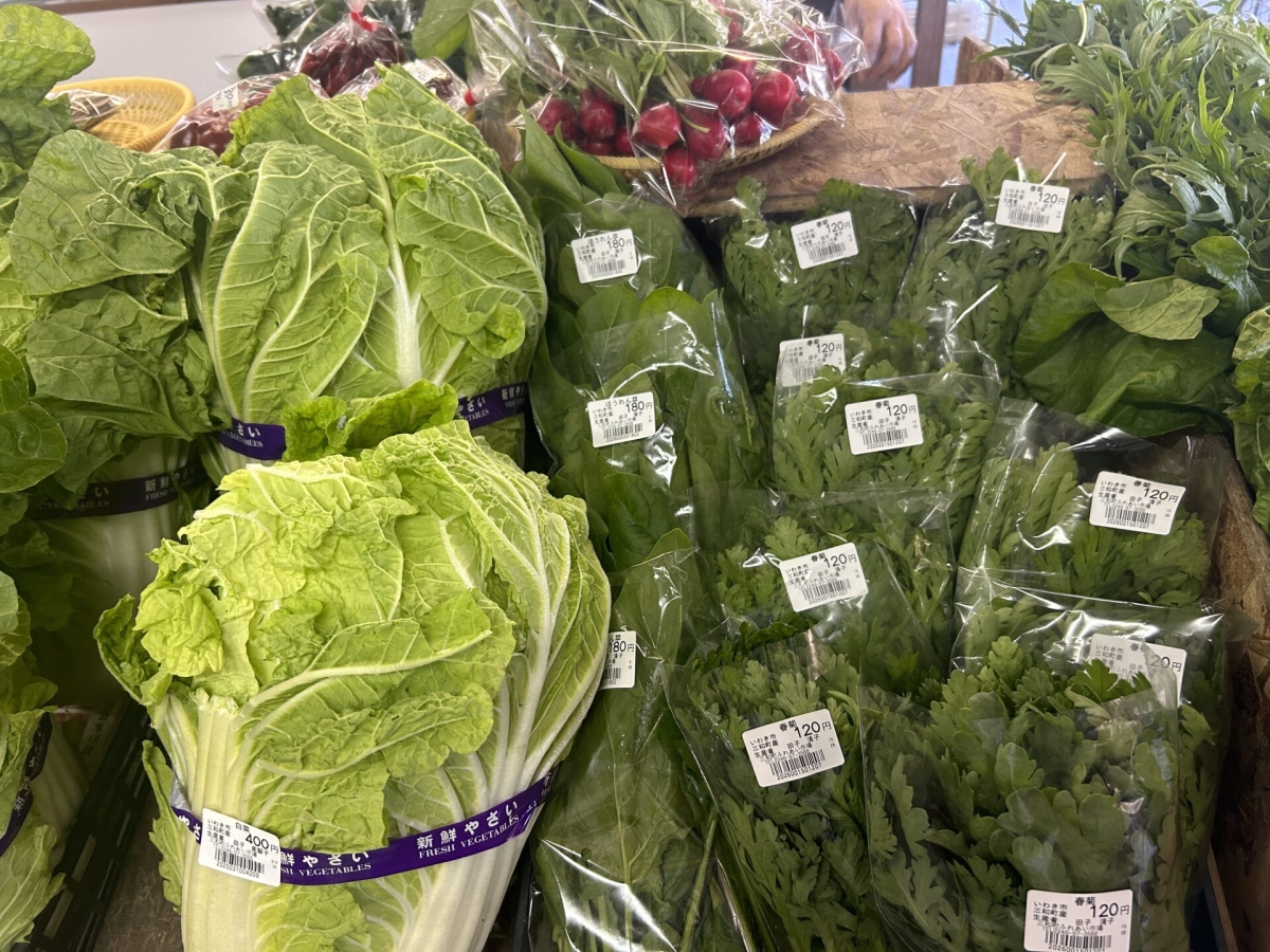 三和町産の迫力のある白菜や、色鮮やかな二十日大根など、季節によってさまざまな野菜が棚を彩ります。