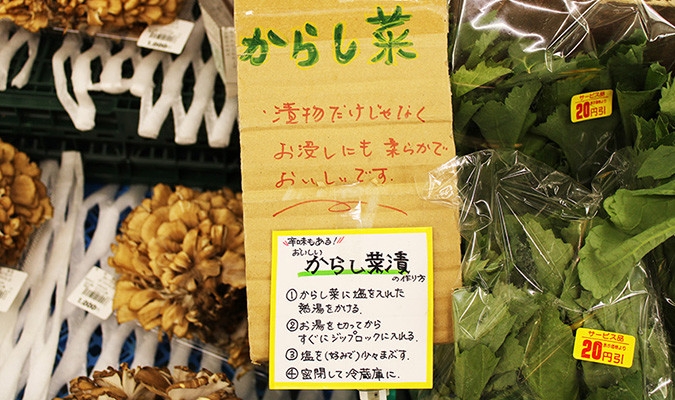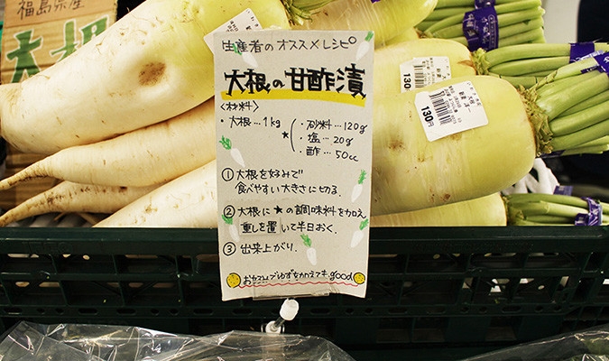生産者から聞いたオススメのレシピや、主婦目線からのオススメの食べ方をお客さんにわかりやすく、店員さんの手作りPOPが教えてくれるので、調理したことのない野菜でも安心して購入することができます。